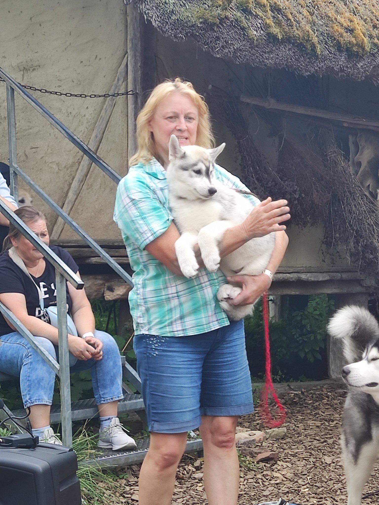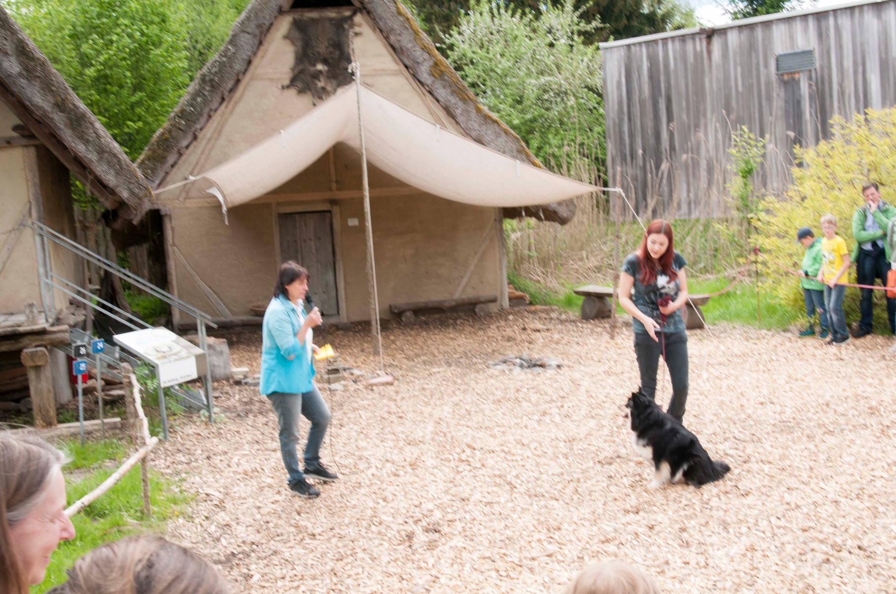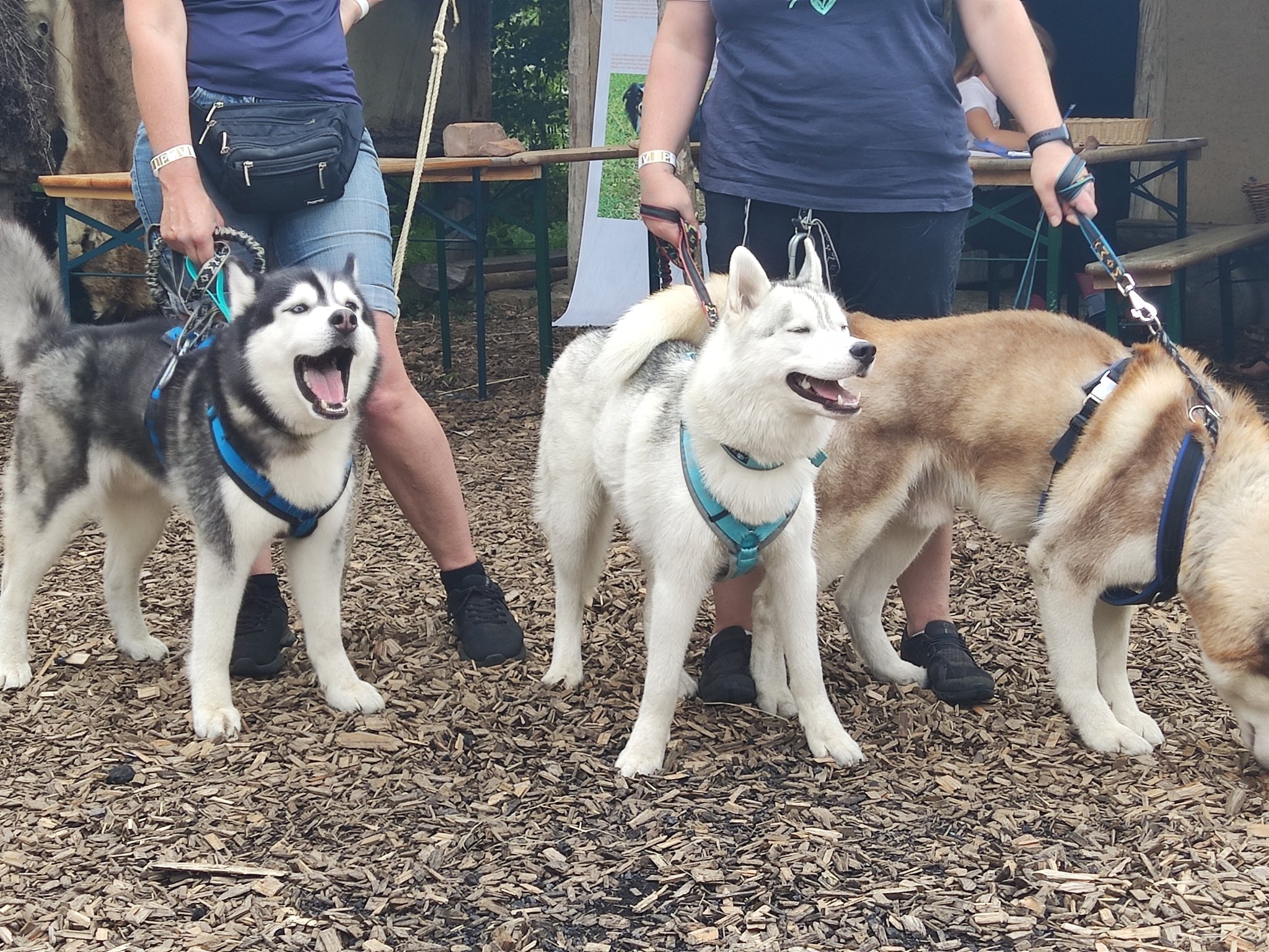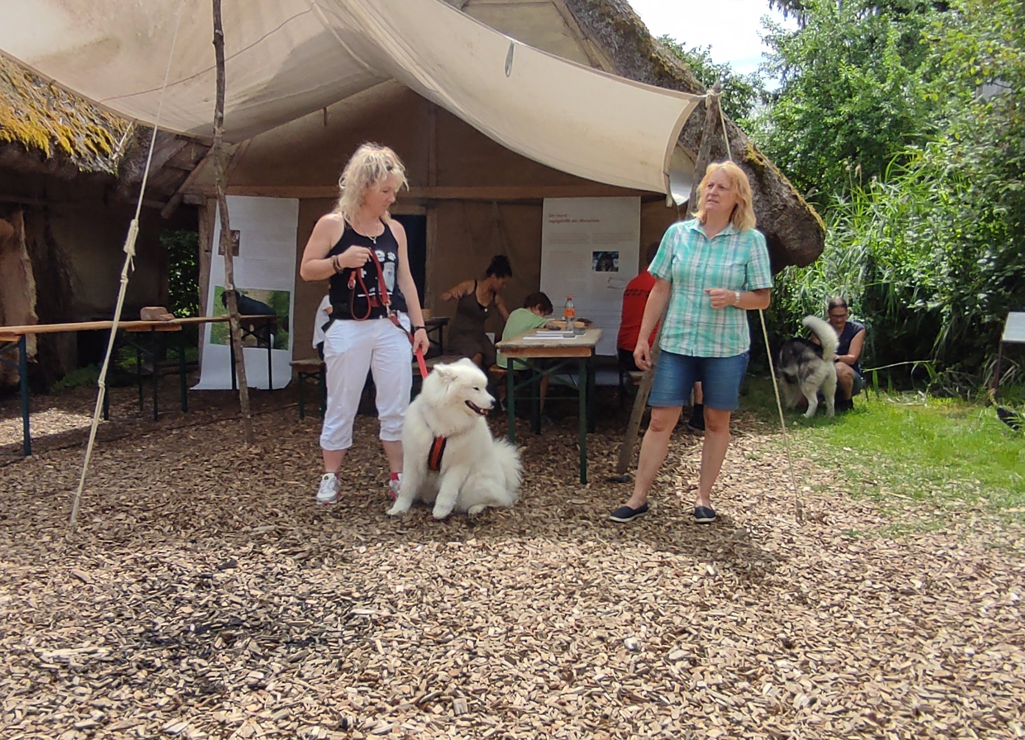 Da sich unsere Nordischen am besten für solche Zwecke eignen, hatten wir das Vergnügen an einem schattigen Platz, inmitten von nach gebauten, steinzeitlichen Häusern, unseren Infostand auf zubauen und unsere nordischen Hunde zu präsentieren.